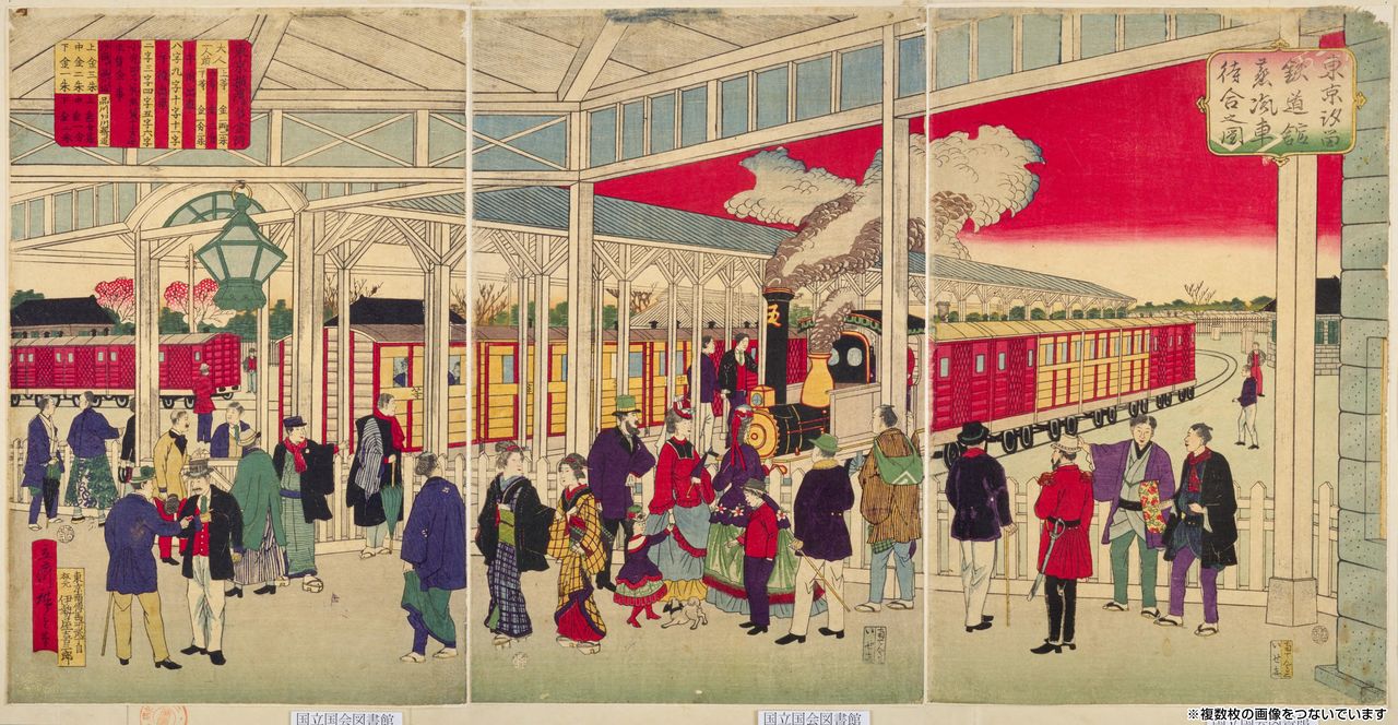 لوحة تم رسمها في عام 1873 بعنوان ”مشهد انتظار القطار البخاري في محطة شيودومي بطوكيو“. تُظهر اللوحة حيوية رصيف المحطة عندما كانت محطة لتوقف القطارات. المصدر: أرشيف مكتبة البرلمان الوطنية