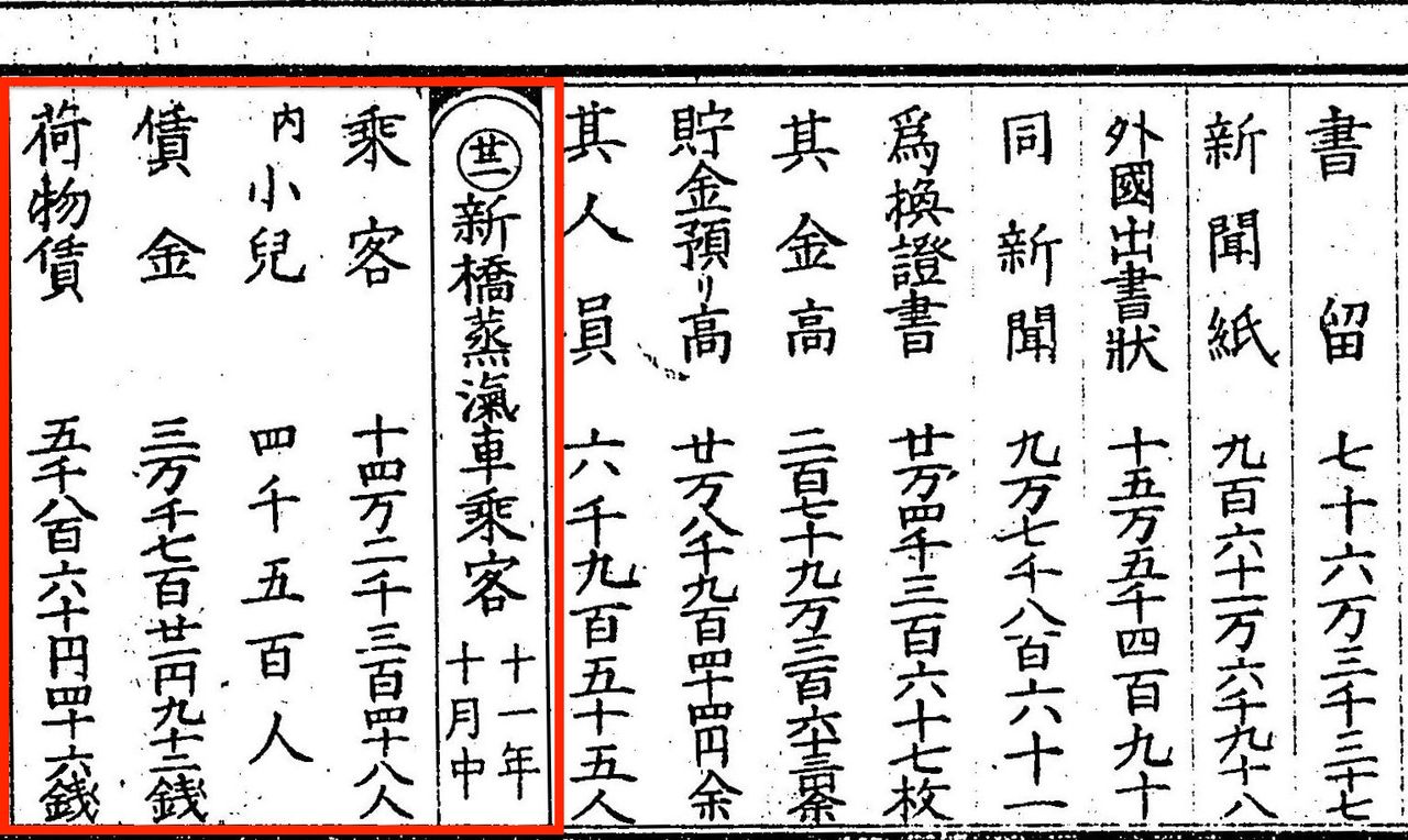 وفقًا لـ ”دليل طوكيو المحمول“ فقد بلغ عدد الركاب 142,348 راكبًا (منهم 4,500 طفل) في شهر أكتوبر/تشرين الأول عام 1877، وبلغ إجمالي قيمة أجرة الركاب 31,721 ينًا و92 سينًا (كل ين يساوي مئة سين)، أما إجمالي أجور نقل البضائع فكان 5,860 ينًا و46 سينًا.