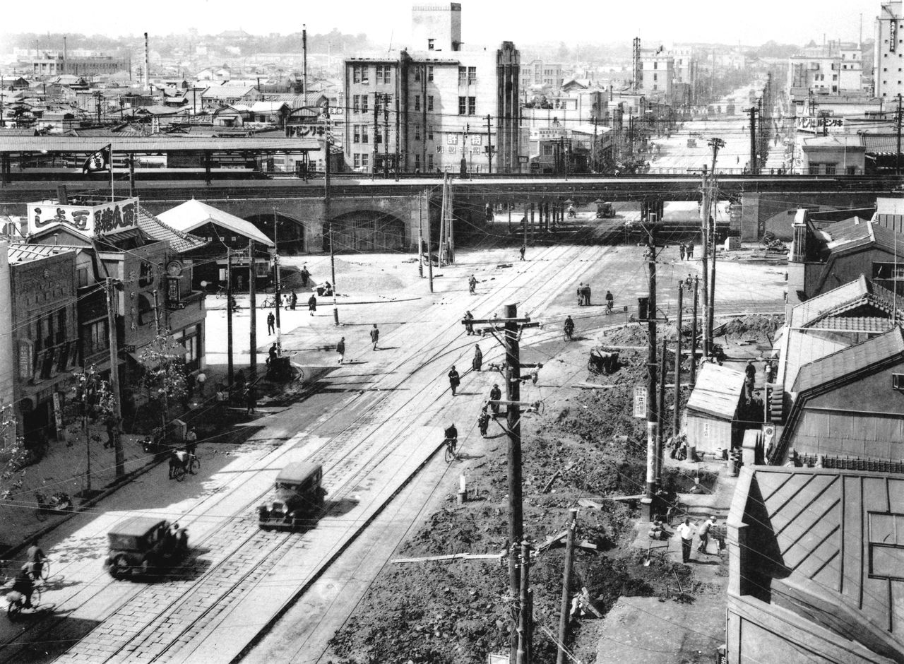المنطقة المحيطة بمحطة كاراسوموري القديمة التي كانت سلف محطة شينباشي الحالية. يظهر في الجزء العلوي رصيف المحطة وخط السكة الحديدية. تم التصوير في عام 1930 تقريبًا. المصدر: أرشيف متحف السكك الحديدية