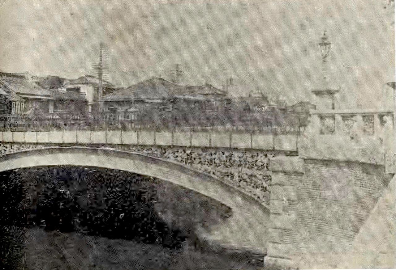 جسر شينباشي كما كان عند إعادة بنائه ليصبح جسرًا حديديًا عام 1899. المصدر: كتاب ”أشهر المعالم السياحية في اليابان“، أرشيف مكتبة البرلمان الوطنية