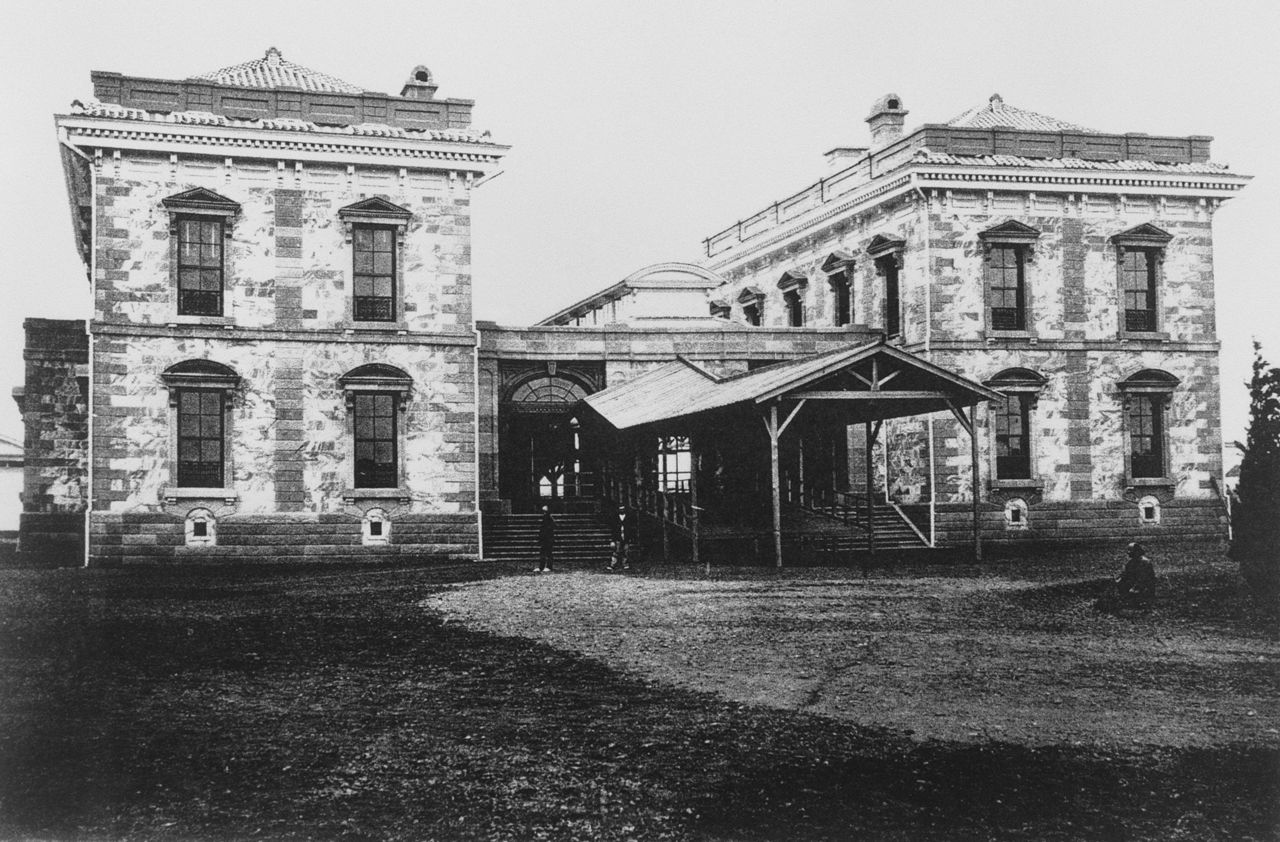 محطة ”شينباشي تيشاجو“ القديمة قبيل افتتاحها مباشرة في عام 1872 [مقدمة من المؤسسة الوطنية لتصفية السكك الحديدية] (© جيجي برس)