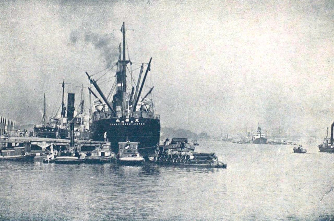 دخول سفينة كبيرة إلى رصيف ”شيباورا“ الذي كان مرشحًا ليكون اسمًا للمحطة (بداية حقبة شوا). ويقع رصيف شيباورا على مسافة تقرب من ثلاثة كيلومترات من محطة تاكاناوا غيتووي. المصدر: ”ألبوم صور طوكيو الكبرى“، أرشيف مكتبة البرلمان الوطنية