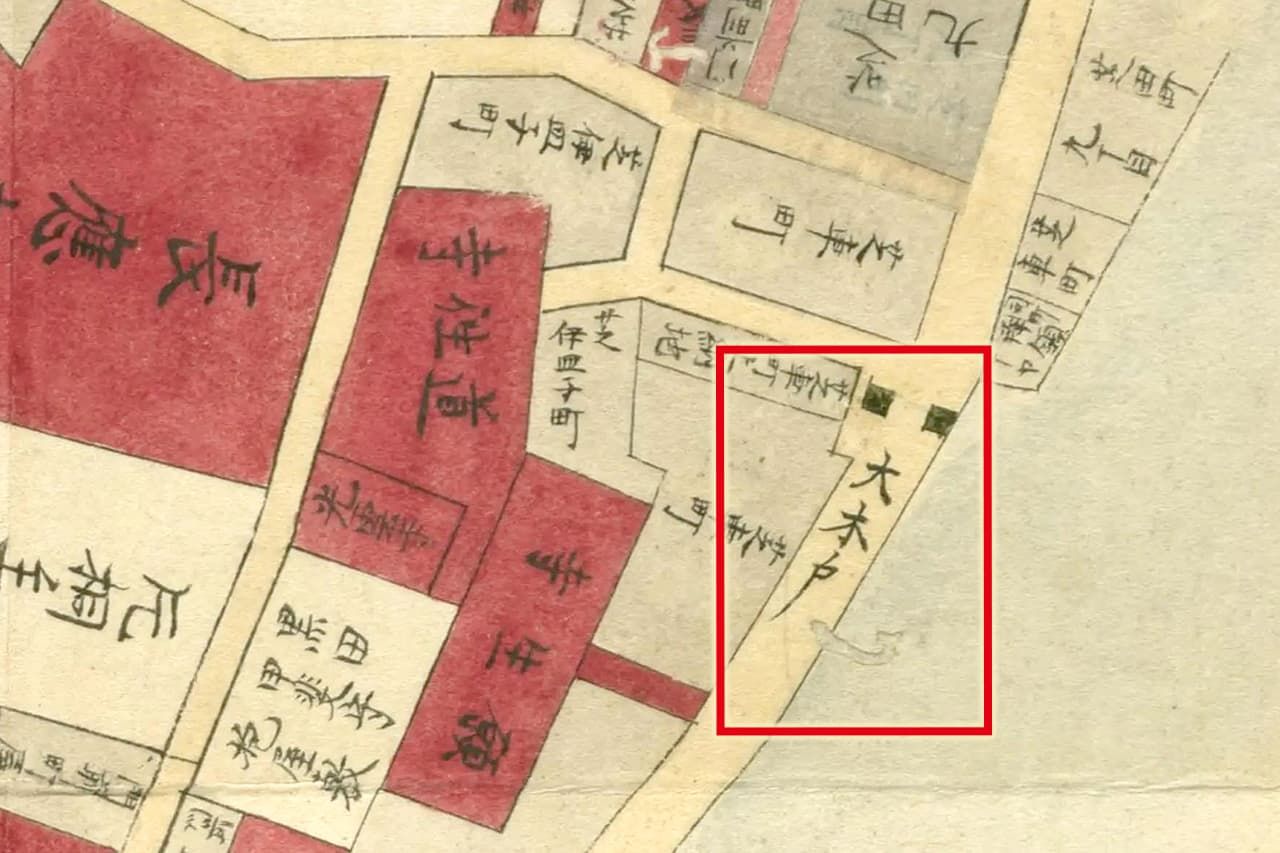 تظهر كلمة ”أوكيدو“ في ”خريطة المنطقة من أزابو شين-نيبّوري إلى شيناغاوا وميغورو“. المصدر: أرشيف مكتبة البرلمان الوطنية