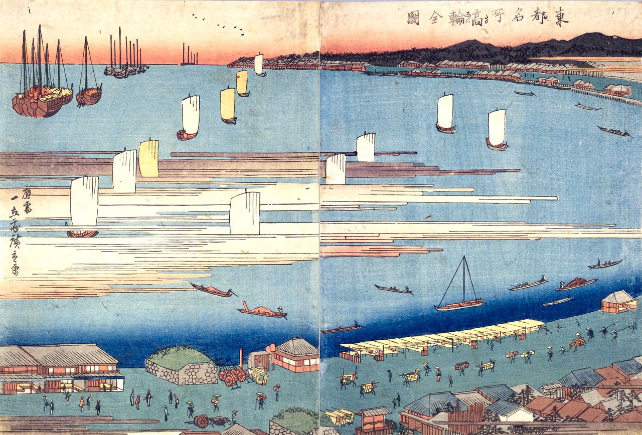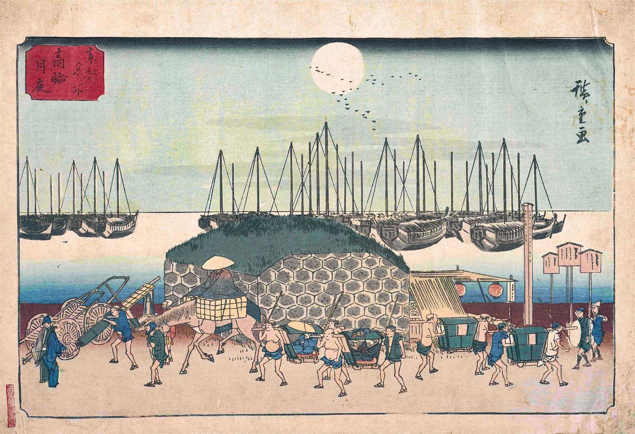 بقيت لوحات كثيرة لبوابة تاكاناوا أوكيدو لكونها من معالم إيدو الشهيرة. وهذه واحدة منها من كتاب ”معالم العاصمة الشرقية، تاكاناوا في ضوء القمر“. المصدر: أرشيف قسم المجموعات الخاصة في مكتبة طوكيو المركزية