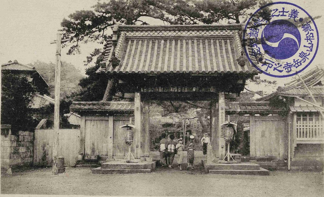 البوابة الأمامية لمعبد سينغاكوجي المرسومة على البطاقة البريدية. سنة التصوير غير معروفة. المصدر: أرشيف قسم المجموعات الخاصة في مكتبة طوكيو المركزية