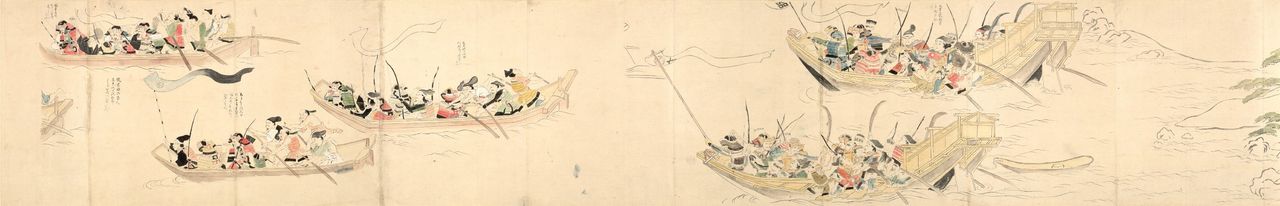 نسخة من ”موكو شوراي إيكوتوبا (قصة مصورة عن الغزوات المغولية)“ تصور قوات الشوغونية وهي تتخلص من بقايا جيش يوان المحطم.(بإذن من مكتبة جامعة كيوشو)