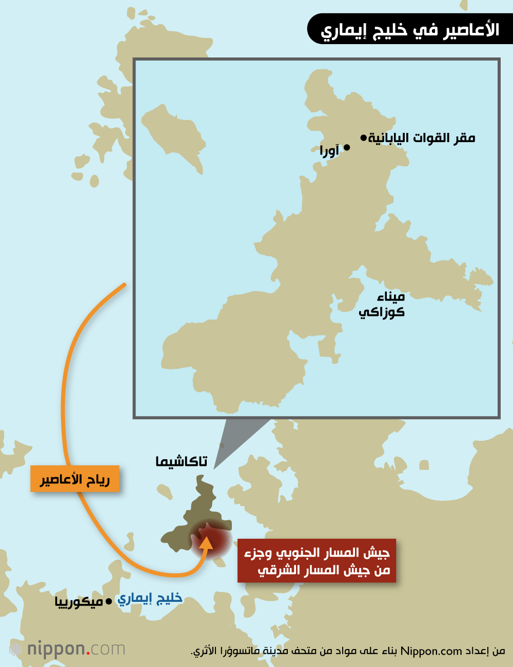 تقع الجزيرة عند مدخل خليج إيماري إلى الشمال حيث تكون مثل حاجز للأمواج، ما يحافظ على هدوء مياه الخليج نسبيا. ولكن السكان يقولون إنه عندما تمر الأعاصير عبر تسوشيما، تعصف الرياح – كما هو معروف – بشدة من الجنوب إلى الشمال، ما يؤدي إلى هيجان مياه الخليج. ويبدو أنه من المحتمل أن هذه كانت الظروف التي واجهت الأسطول المغولي عند وصوله إلى تاكاشيما.