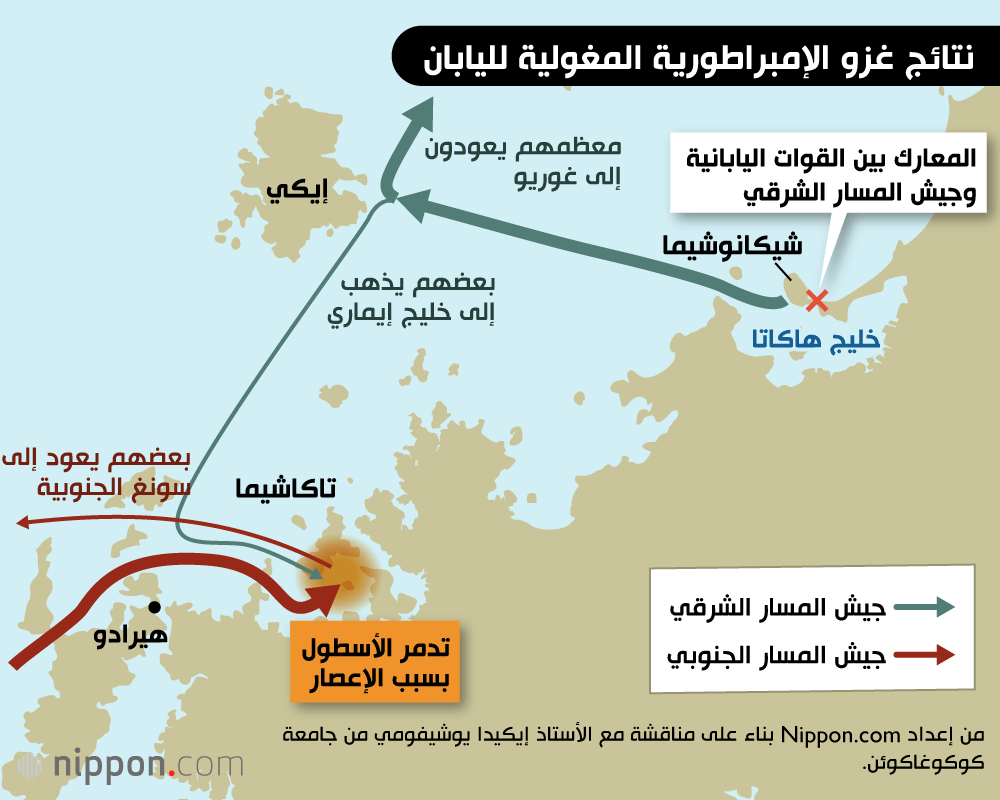 تمكنت الإمبراطورية المغولية من الاستيلاء على جزء كبير من القارة الأوراسية في غضون أقل من قرن من الزمن، وذلك بفضل تفوق قواتها الخيالة. إلا أنها لم تكن تمتلك خبرة في المعارك البحرية، ما يعني أنها اعتمدت على غوريو وسونغ الجنوبية لبناء أسطول وتوفير قدر كبير من القوة القتالية. لم يكن أمام هؤلاء الجنود خيار سوى القتال لصالح الإمبراطورية المحتلة، وربما لم تكن معنوياتهم مرتفعة. واجهت الإمبراطورية المغولية – التي لا تقهر على اليابسة – صعوبة في البحر واصطدمت بقوة إعصار لا تقاوم، وعانت ما قد يُنظر إليه على أنه أول هزيمة ساحقة لها. وتخلت بعد محاولتين عن فكرة غزو اليابان.
