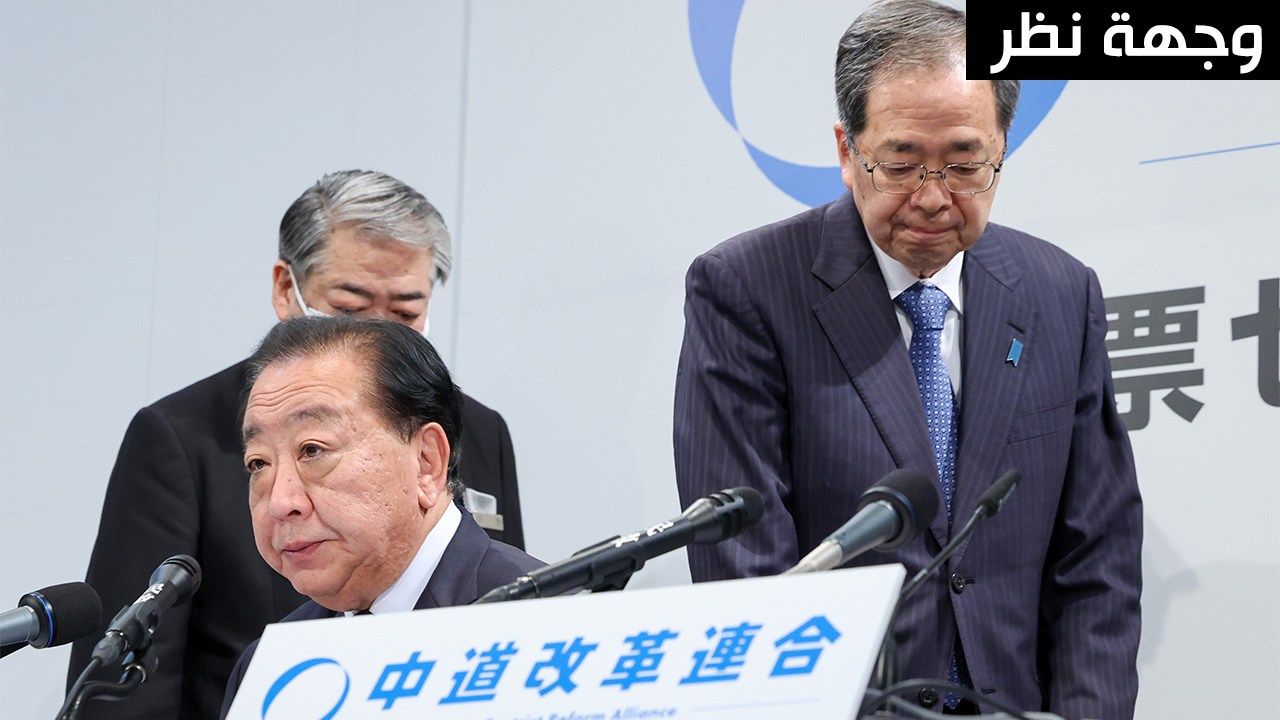 (المقالة الأصلية منشورة باللغة اليابانية بتاريخ 17 فبراير/شباط عام 2026. الترجمة من الإنكليزية. صورة العنوان: الزعيمان المشاركان لتحالف الإصلاح الوسطي، نودا يوشيهيكو [جالسا إلى اليسار] وسايتو تيتسوؤ [إلى اليمين]، يستعدان لظهور تلفزيوني مساء 8 فبراير/شباط مع توالي التقارير الكئيبة بشأن حزبهما. © جيجي برس)