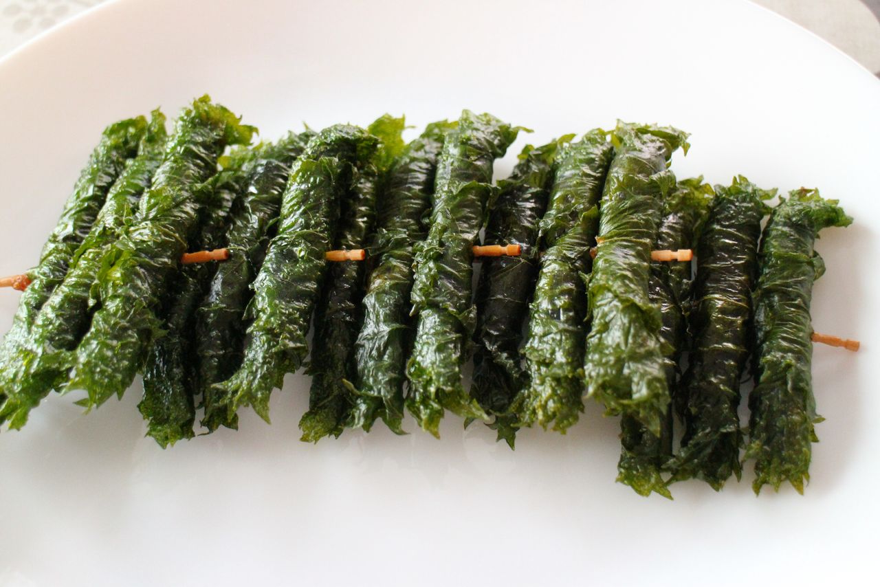 تُحوّل أوراق الأؤجيسو المفرومة، عند إضافتها كطبقة أخيرة لطبق الباستا الطازجة المغطاة بصلصة المينتايكو الغنية (بطارخ سمك القد الحار)، الطبق الإيطالي التقليدي إلى طبق ياباني بنكهة آسيوية أصيلة.