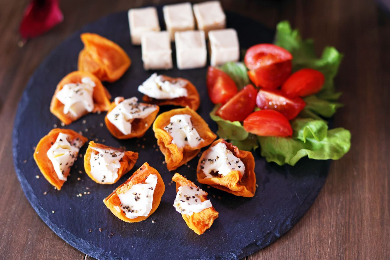 قد يبدو الأمر غير متوقع، إلا أن فاكهة الهوشيغاكي اليابانية المجففة تتوافق بشكل رائع مع الجبن الكريمي. كما أن إضافة رشة من الفلفل الأسود تضفي عليها لمسة رائعة وتجعل هذا الطبق مثاليا لتناوله إلى جانب النبيذ.