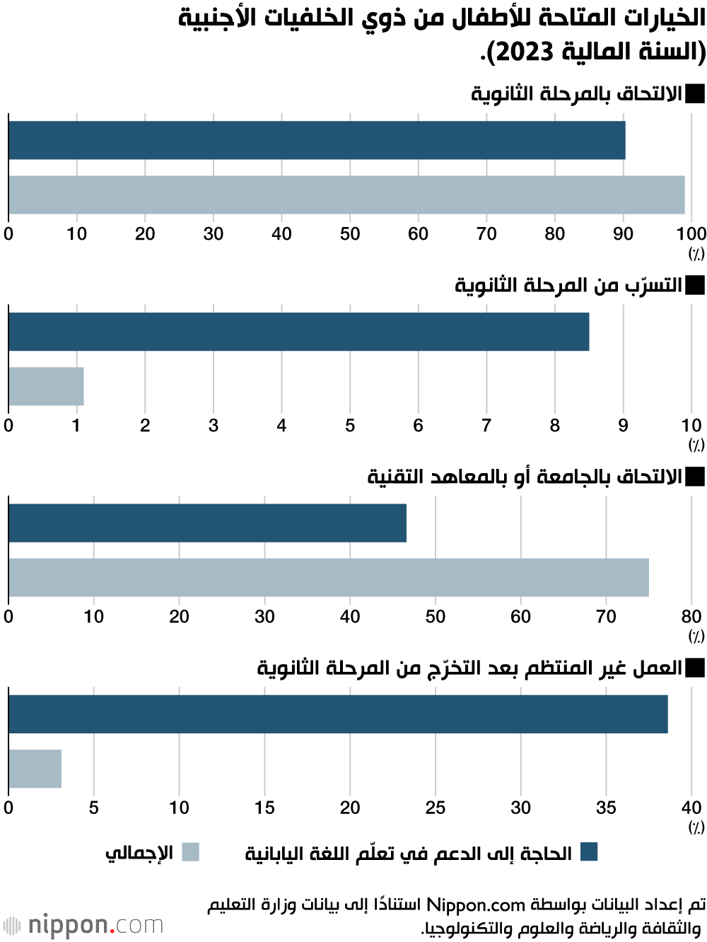 ووفقًا لدراسة استقصائية أجرتها وزارة التعليم والثقافة والرياضة والعلوم والتكنولوجيا (MEXT) خلال السنة المالية 2023، وشملت طلاب المرحلة الإعدادية الذين لا يتقنون اللغة اليابانية اليومية ويحتاجون إلى دعم لغوي إضافي، بلغت نسبة الالتحاق بالمرحلة الثانوية نحو 90%. وعلى الرغم من ارتفاع هذه النسبة، فإنها تظل أقل بكثير من نسبة الالتحاق بين الطلاب الذين تُعد اليابانية لغتهم الأم، والتي تقترب من 100٪. وبغض النظر عن قدراتهم الأكاديمية أو طموحاتهم الشخصية، لا يتمكن كثير من هؤلاء الطلاب من الالتحاق بالمدارس الثانوية التي يطمحون إليها. ونتيجة لذلك، يتجهون إلى خيارات بديلة مثل المدارس المسائية أو برامج المدارس الثانوية ذات المستوى الأدنى، وهي مؤسسات تعاني في الغالب من نقص في عدد المتقدمين مقارنة بالحصص المقررة. ويعود ذلك في جانب كبير منه إلى ضعف إتقانهم للغة اليابانية المتقدمة، وهو ما يشكّل عائقًا حاسمًا أمام فرصهم التعليمية.