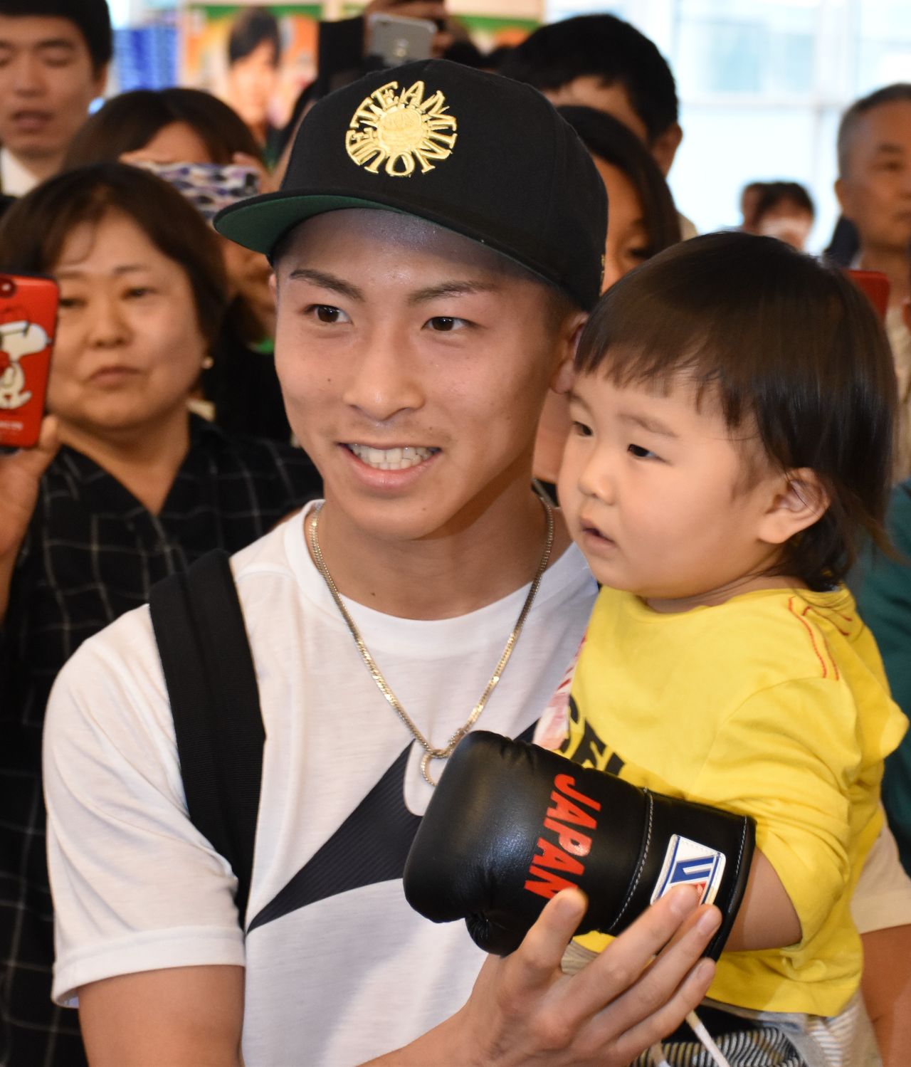 إينوأُويه ناؤيا يبتسم للجماهير عند عودته منتصرًا إلى مطار هانيدا بطوكيو من الدور نصف النهائي لبطولة (WBSS) في الحادي والعشرين من مايو/ آيار 2019.(جيجي برس)