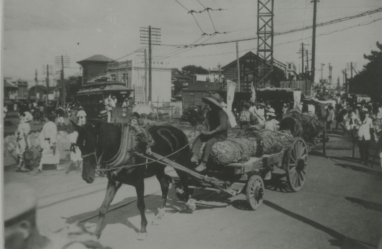 عربة يجرها حصان في شينجوكو في عصر تايشو (1912–1926)، (الصورة بإذن من متحف شينجوكو التاريخي).
