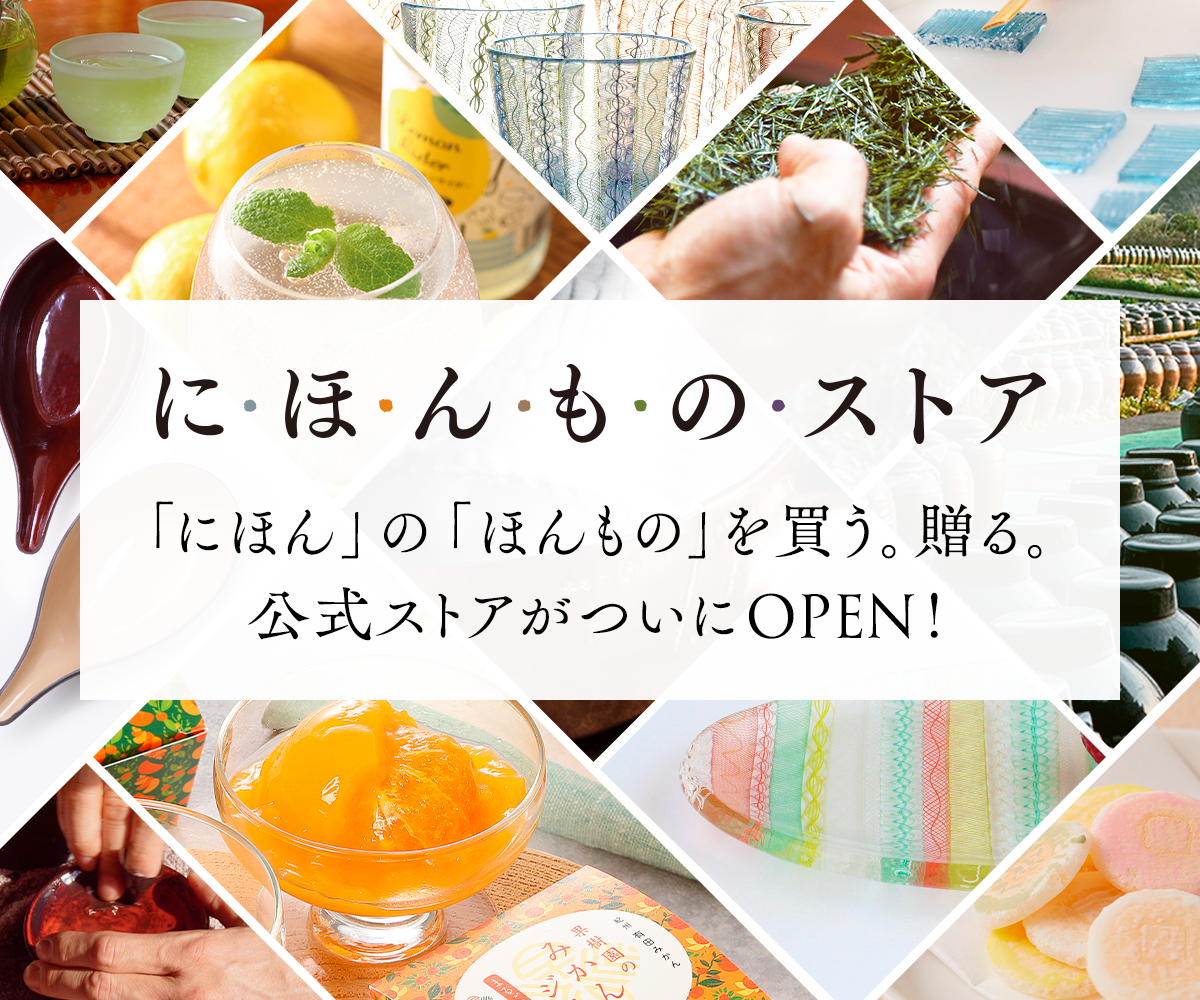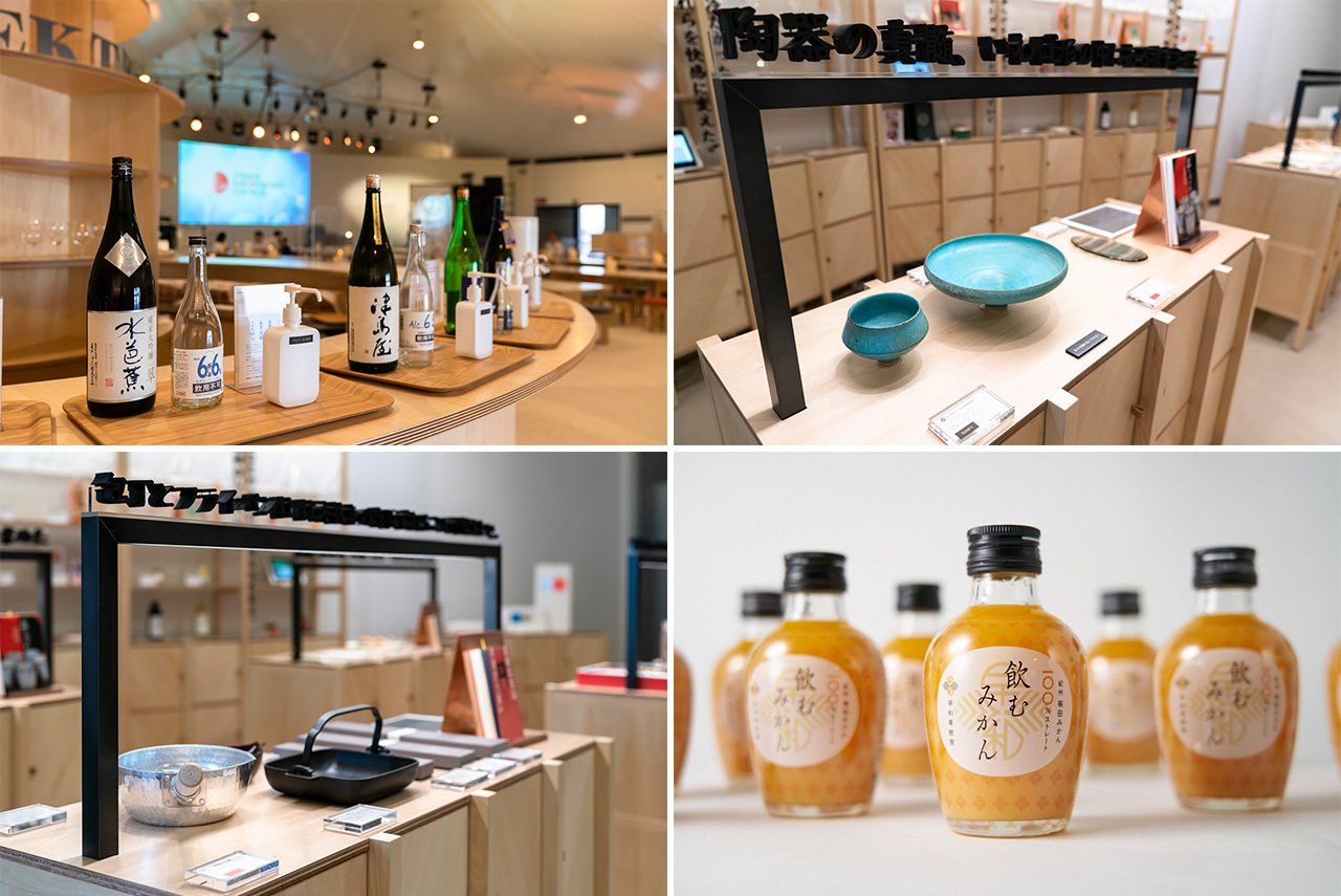 منتجات عالية الجودة معروضة في ردهة مقر برنامج (جي-ويف نيهونمونو) الإذاعي. في اتجاه عقارب الساعة من أعلى اليسار: تشكيلة من أنواع الساكي المختارة من ناكاتا، آواني الطعام الفاخرة، عصير اليوسفي الحامضي، وأدوات الطبخ اليابانية التقليدية. تصوير أووادايرا تسونيبومي.