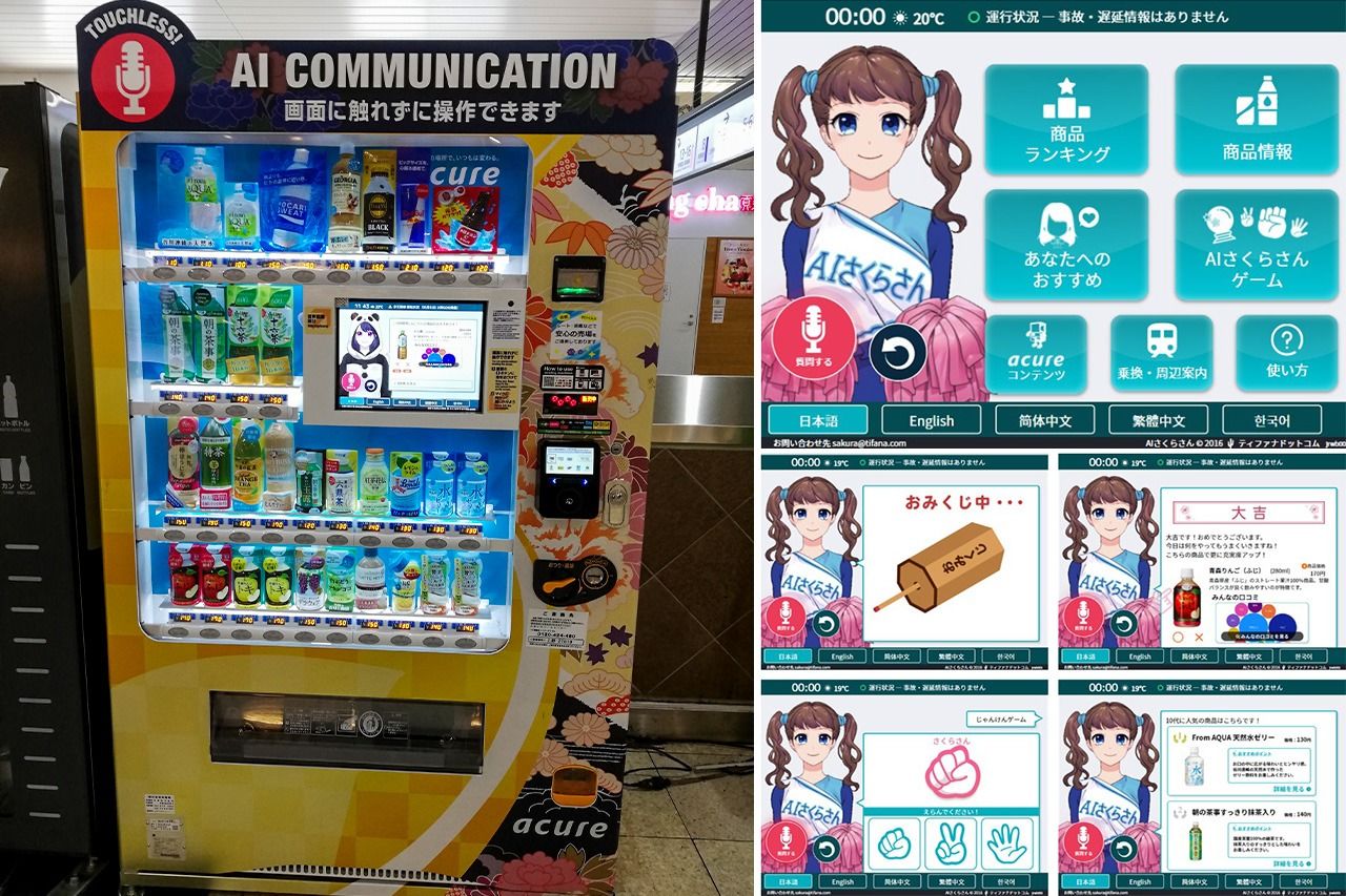هناك أيضًا شركات تختبر الذكاء الاصطناعي. فاعتبارًا من مايو/ أيار تختبر شركة جي ار ايست ووتر بيزنيس آلات بيع المشروبات التي تعمل بالذكاء الاصطناعي في محطات شينجوكو وأوينو وطوكيو وشيناغاوا وأكيهابارا في طوكيو. أين يمكن لشخصية تدعى أيه أي ساكورا- صن معروضة على ”لوحة اللمس“ أن تلعب ألعابًا مع العملاء قد تؤدي إلى توصيات بمشروبات أو قسائم هدايا.