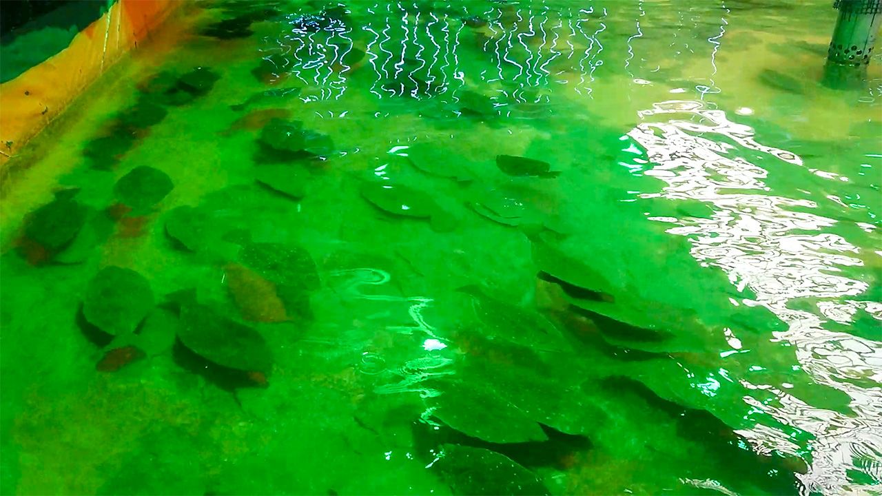 تم استخدام هذا الحوض المضاء بمصابيح LED خضراء في تجارب استزراع الأسماك المفلطحة (حقوق الصورة لكلية العلوم الحيوية البحرية بجامعة كيتاساتو).