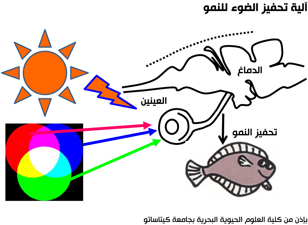 يقول تاكاهاشي: ’’الأسماك المفلطحة بارعة جدا في التمييز بين الألوان، ولا سيما عندما يتعلق الأمر بحساسيتها للضوء الأخضر وقدرتها على تمييزه‘‘. ويعتقد تاكاهاشي أن تعريض السمك لضوء مشابه للون الأخضر الذي تتعرض له تلك الأسماك في بيئتها الطبيعية يجعلها أكثر جوعا وأكثر نشاطا.