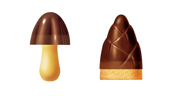 على اليسار ”كينوكو نو ياما“ (رقم التسجيل 6031305) و”تاكينوكو نو ساتو“ (رقم التسجيل 6419263)، الصورة مقدمة من: منصة معلومات براءات الاختراع ”J-PlatPat“