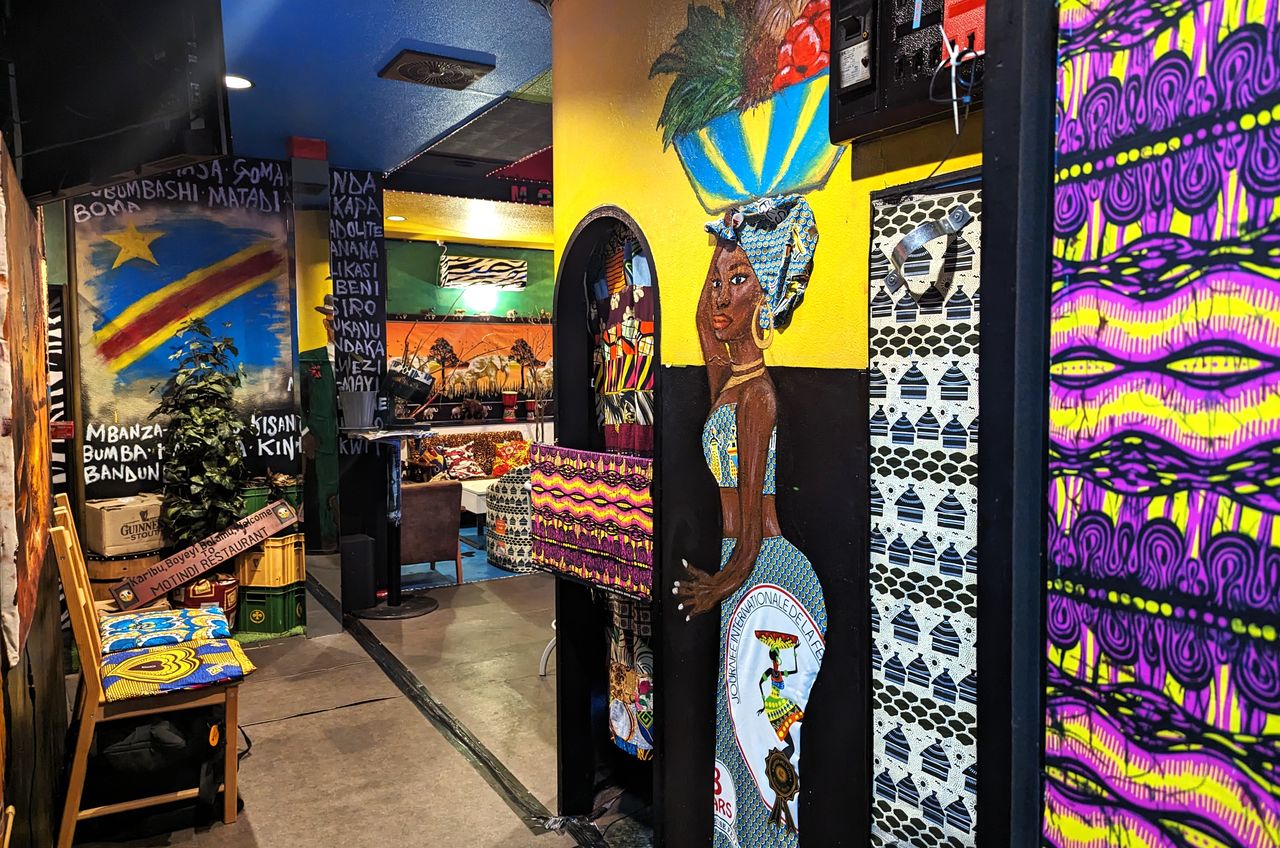 معظم اللوحات والديكورات الموجودة داخل المطعم من صنع السيدة ماي. يتم استخدام القماش الكونغولي في الأزياء النسائية تصوير: كومازاكي تاكاشي