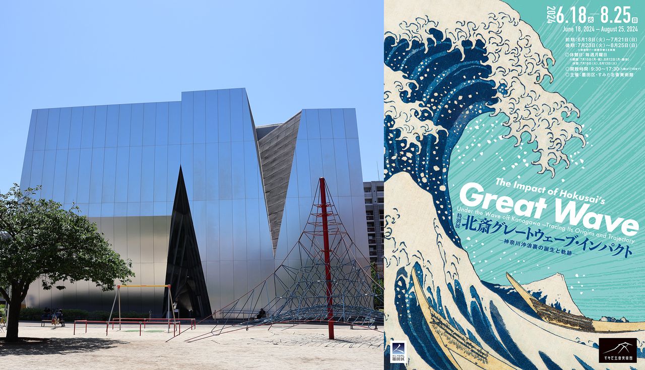 على اليسار: متحف سوميدا هوكوساي الذي يقع بالقرب من المكان الذي ولد فيه الفنان، ويحظى بشعبية لدى الزوار الأجانب، (© Nippon.com). إلى اليمين: ملصق يعلن عن معرض ”الموجة العظيمة“ الذي يستمر من 18 يونيو/حزيران إلى 25 أغسطس/آب (الصورة من تقديم متحف سوميدا هوكوساي).