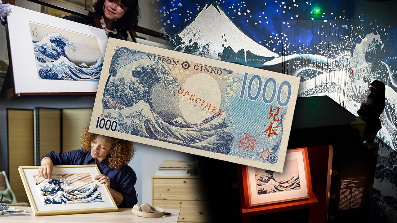 (النص الأصلي باللغة اليابانية، الترجمة من الإنكليزية. صورة العنوان الرئيسي: الوجه الخلفي للورقة النقدية الجديدة من فئة ألف ين في الوسط (© رويترز)، محاطة مع اتجاه عقارب الساعة من أعلى اليسار بمعرض هوكوساي في المتحف البريطاني بتاريخ 10 يناير/ كانون الثاني 2017 (© كارل كورت/غيتي إيمجز)، ومركز كومونت للفنون في إيكس أون بروفانس بتاريخ 6 نوفمبر/ تشرين الثاني 2019 (© وكالة الصحافة الفرنسية، جيجي)، وموجة هوكوساي في ليغولاند في الدنمارك بتاريخ 28 ديسمبر/ كانون الأول 2022 (© رويترز). الصورة من تجميع Nippon.com).
