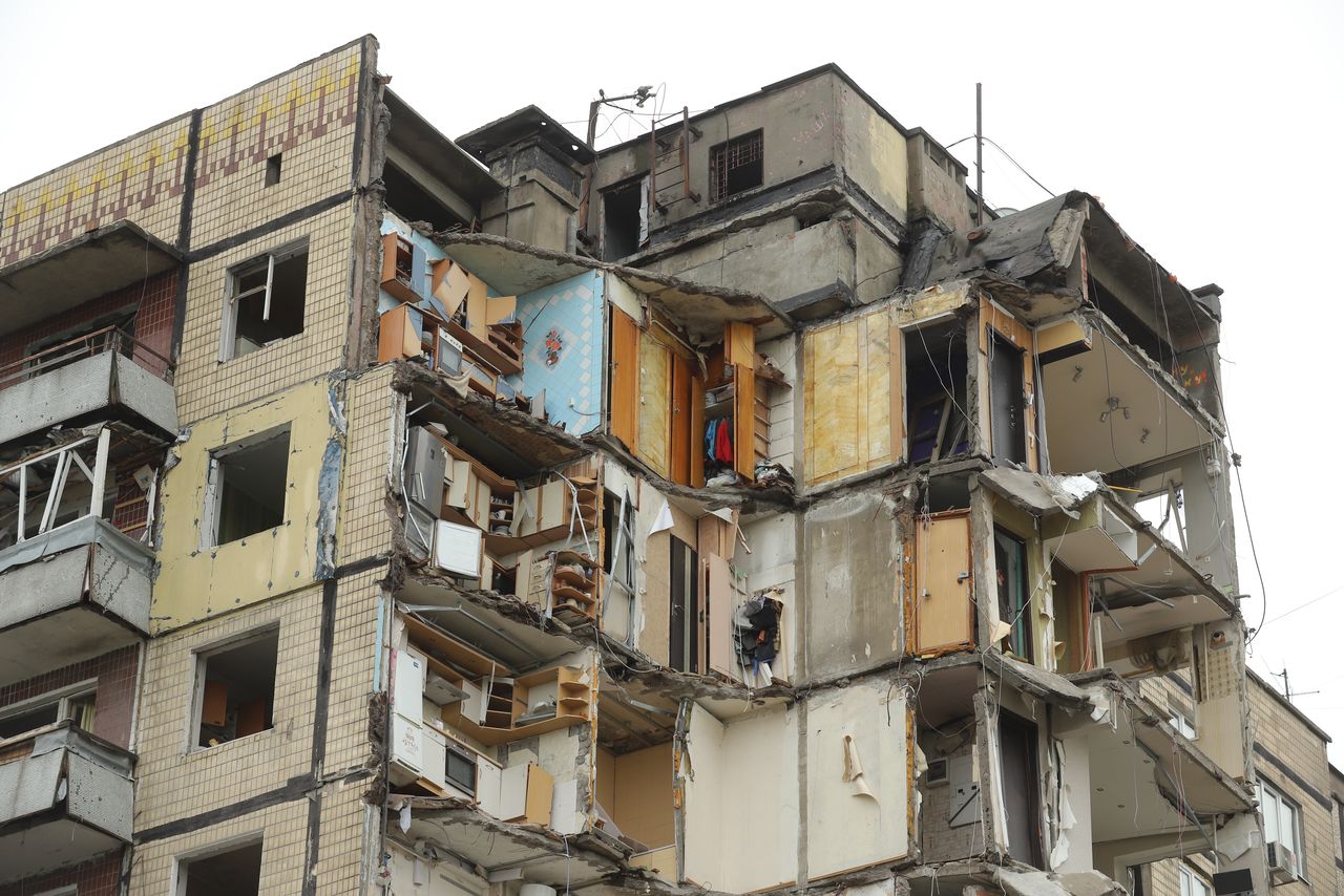 تعرض مبنى سكني لتدمير جزئي بواسطة صاروخ كروز روسي في 14 يناير/كانون الثاني 2023. أسفر الهجوم عن مقتل 46 شخصًا من بينهم 6 أطفال وإصابة 80 آخرين. (بإذن من مدينة دنيبرو)
