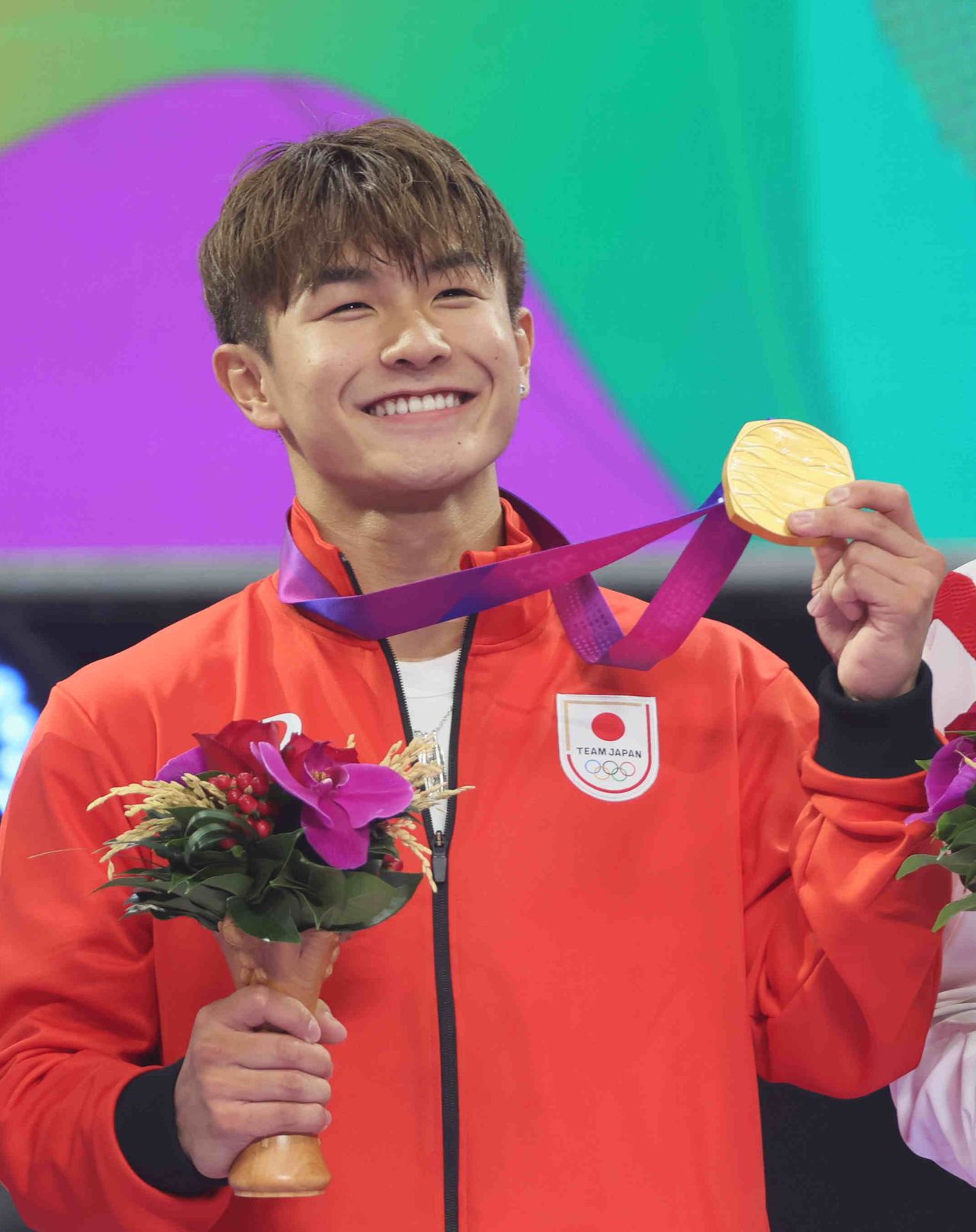 ناكاراي يبتسم بعد فوزه بالميدالية الذهبية في بطولة آسيا 2023 في هانغتشو، الصين. (© جيجي برس)