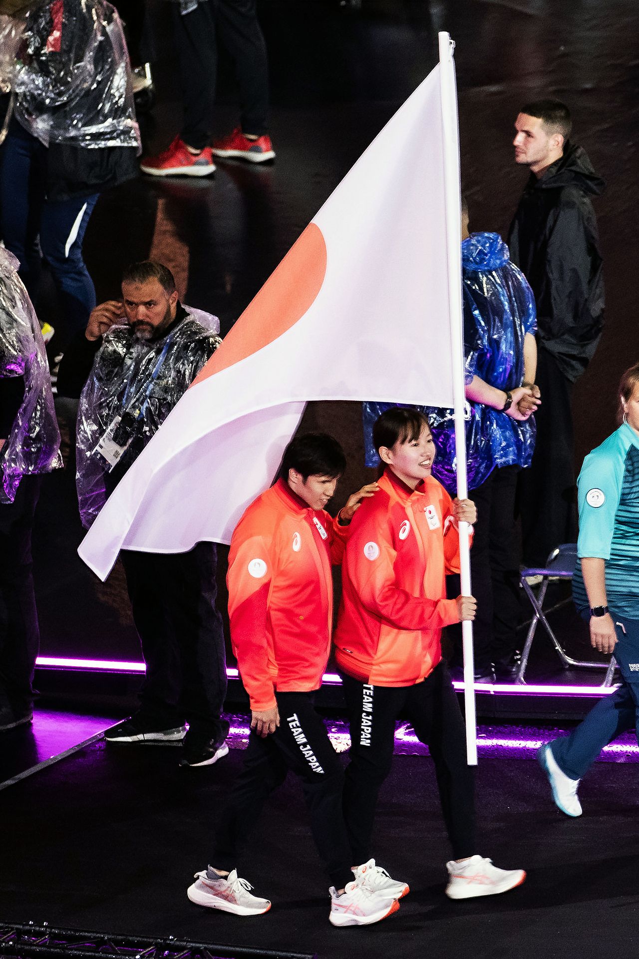 وادا ناتسوكي (يمين) وكيمورا كيئتشي يحملان العلم الياباني في حفل ختام دورة الألعاب البارالمبية 2024 في باريس. (© أوتشي تاكاو)