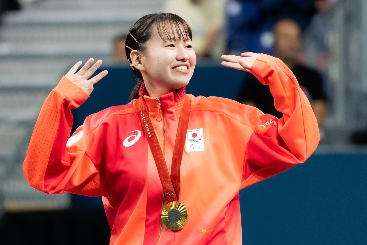 وادا تستعرض ميداليتها الذهبية خلال حفل توزيع الميداليات في دورة الألعاب البارالمبية في باريس. (© أوتشي تاكاو)