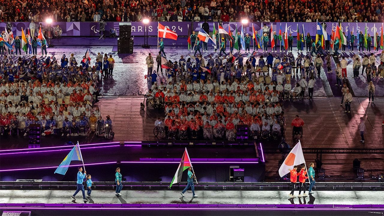 عضو الفريق البارالمبي الياباني في حفل افتتاح دورة ألعاب باريس في 28 أغسطس/ آب 2024. (© أوتشي تاكاو)