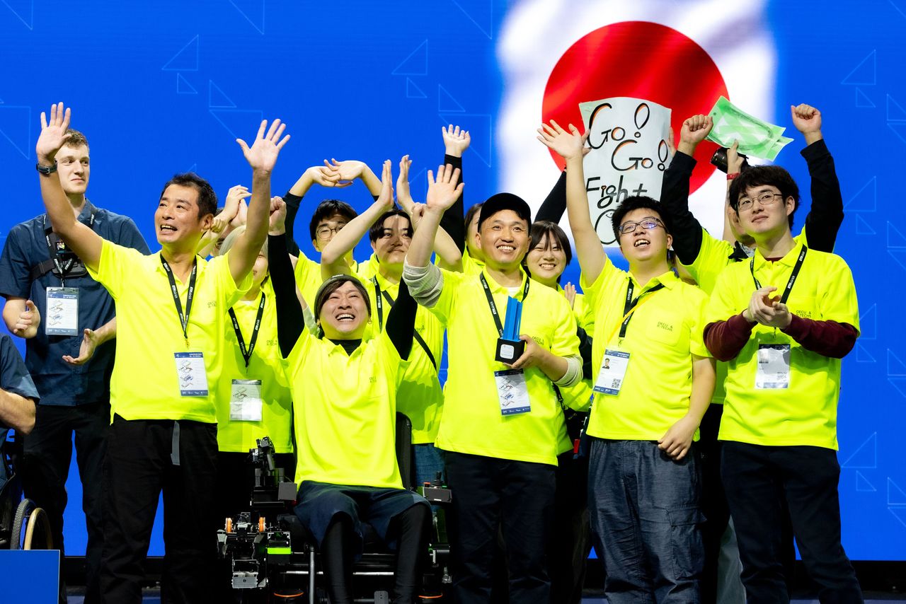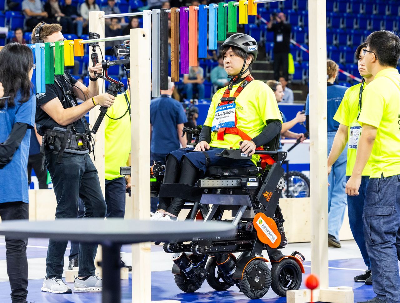 (النص الأصلي باللغة اليابانية صورة العنوان الرئيسي: الكرسي المتحرك الكهربائي لفريق جامعة أوساكا للإلكترونيات والاتصالات ”OECU&R-Techs“، الذي ينافس في مسابقة سايباثلون. الشخص الذي يركب على الكرسي المتحرك هو السيد أوغورا)