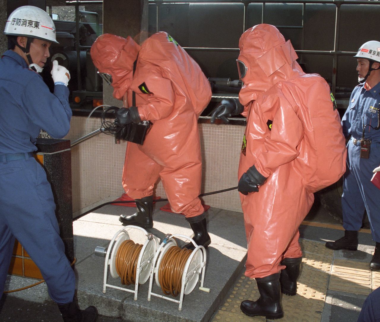 أعضاء من إدارة الإطفاء في طوكيو يرتدون سترات واقية يدخلون محطة ”كاسوميغاسيكي“ في 20 مارس/ آذار 1995. (© جيجي برس)