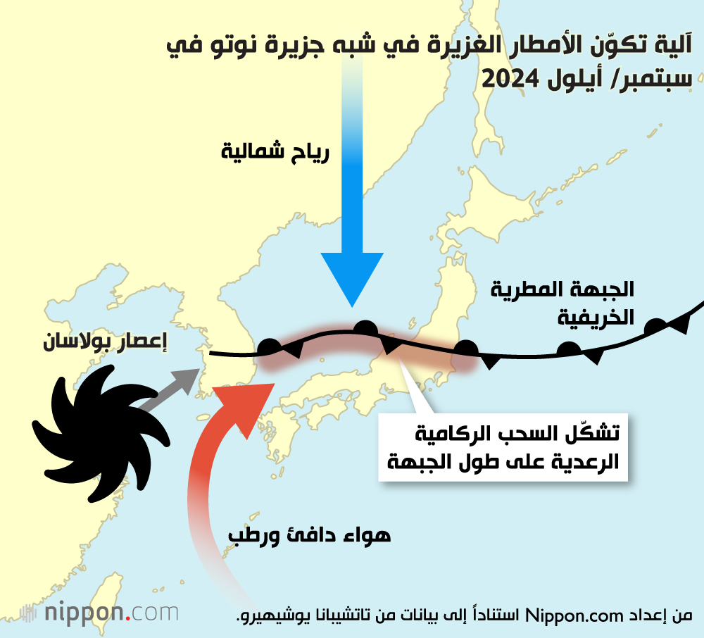 ويمكن أن تتوافر هذه الأنواع المختلفة من الظواهر الجوية في آن واحد، مما يزيد من خطر وقوع الكوارث. ففي سبتمبر/ أيلول 2024، على سبيل المثال، ضربت أمطار غزيرة شبه جزيرة نوتو في محافظة إيشيكاوا نتيجة لتراكمات سحابية كثيفة، ما زاد من معاناة سكان المنطقة الذين كانوا قد تعرضوا مؤخراً لزلزال مدمر في يناير/ كانون الثاني من نفس العام. وفي ذلك الوقت، ارتفعت درجات حرارة سطح بحر اليابان إلى ما يصل إلى 5 درجات مئوية فوق المعدل الطبيعي، في ظاهرة تعرف باسم ”الذروة الحرارية البحرية“، مما أدى إلى إطلاق سيل من بخار الماء في الغلاف الجوي، لتتكون سحب مطرية كثيفة مسقطة أمطار غزيرة جارفة.