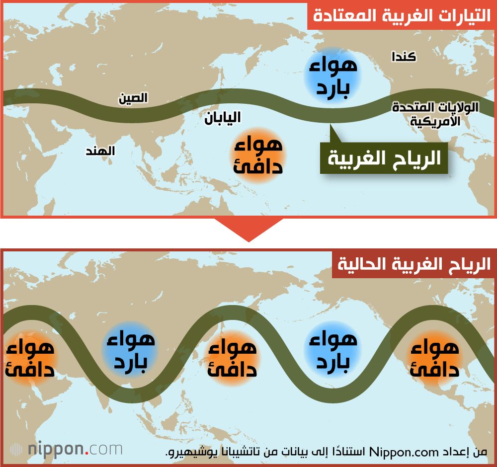 فعلى سبيل المثال، تتشكل منطقة الضغط الجوي العالي فوق مرتفعات التبت ومنغوليا خلال أشهر الصيف، وتؤثر على أنماط الطقس في اليابان. غير أن ذوبان الثلوج بشكل أسرع في هذه المناطق القارية قلل من كمية أشعة الشمس التي تنعكس إلى الغلاف الجوي، مما سمح للأرض بامتصاص المزيد من الحرارة وساهم في ارتفاع درجات الحرارة.