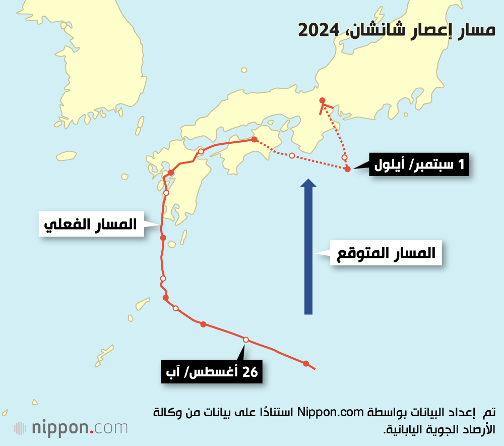ولقد كان إعصار ”شانشان“ عام 2024 مثالاً متطرفاً على ذلك. حيث اقتربت العاصفة في البداية من ساحل اليابان في أواخر أغسطس/ آب متجهةً نحو شبه جزيرة ”كي“ في منطقة كانساي. غير أنها انحرفت غرباً ثم شمالاً، ووصلت في النهاية إلى الشاطئ فوق كيوشو. ومن هناك، اتبعت مساراً مقوساً فوق بحر ’سيتو‘ الداخلي وجزيرة شيكوكو قبل أن تعود إلى البحر جنوباً، حيث انعطفت شمالاً فجأة ووصلت إلى اليابسة مرة أخرى فوق شبه جزيرة ”كي“. وعلى الرغم من أن إعصار شانشان تراجع إلى عاصفة استوائية فوق محافظة شيغا، إلا أنها حامت حول اليابان لمدة أسبوع، مما أدى إلى هبوب الرياح والأمطار وتعطيل شبكات النقل، بما في ذلك إيقاف قطار توكايدو شينكانسن لمدة ثلاثة أيام.
