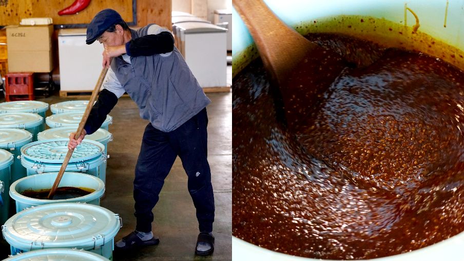 (النص الأصلي باللغة اليابانية، الترجمة من الإنكليزية. صورة العنوان الرئيسي: فوكوي سيئيتشي، أحد العاملين ومستشار لدى هيراي سيئيتشي، والذي عمل سابقًا كطاه فرنسي، يقوم بتحريك المزيج الظاهر إلى اليمين باستخدام مجداف، لتعزيز عملية التخمير والنضج © أوكيتا ياسويوكي)