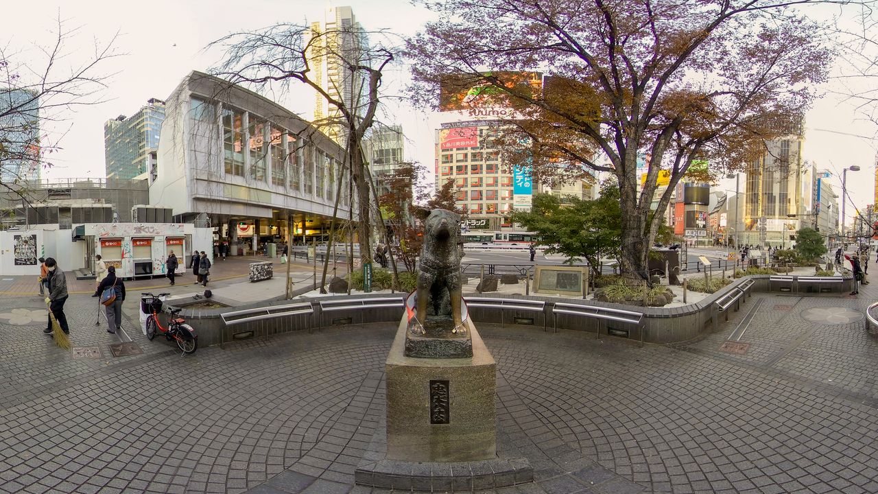 تمثال الكلب هاتشيكو، الذي شُيد في عام 1934. يُذكر هاتشيكو بولائه لسيده، الذي ظل ينتظره بإخلاص يوميًا في المحطة حتى بعد وفاة الرجل. (© سوميسي ناوتو)