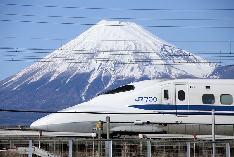 قطار الشينكانسن وجبل فوجي بالتاج الأبيض