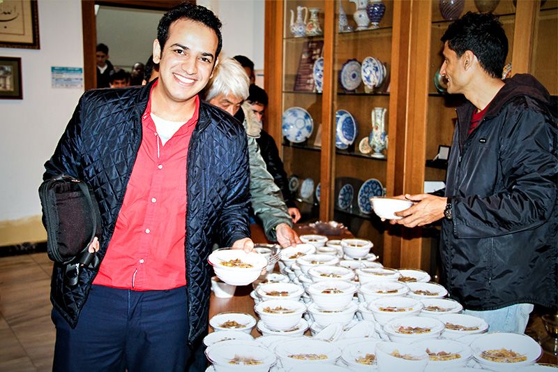 أحد العمال بجامع طوكيو يقوم بتوزيع وجبة الغداء على المصلين.