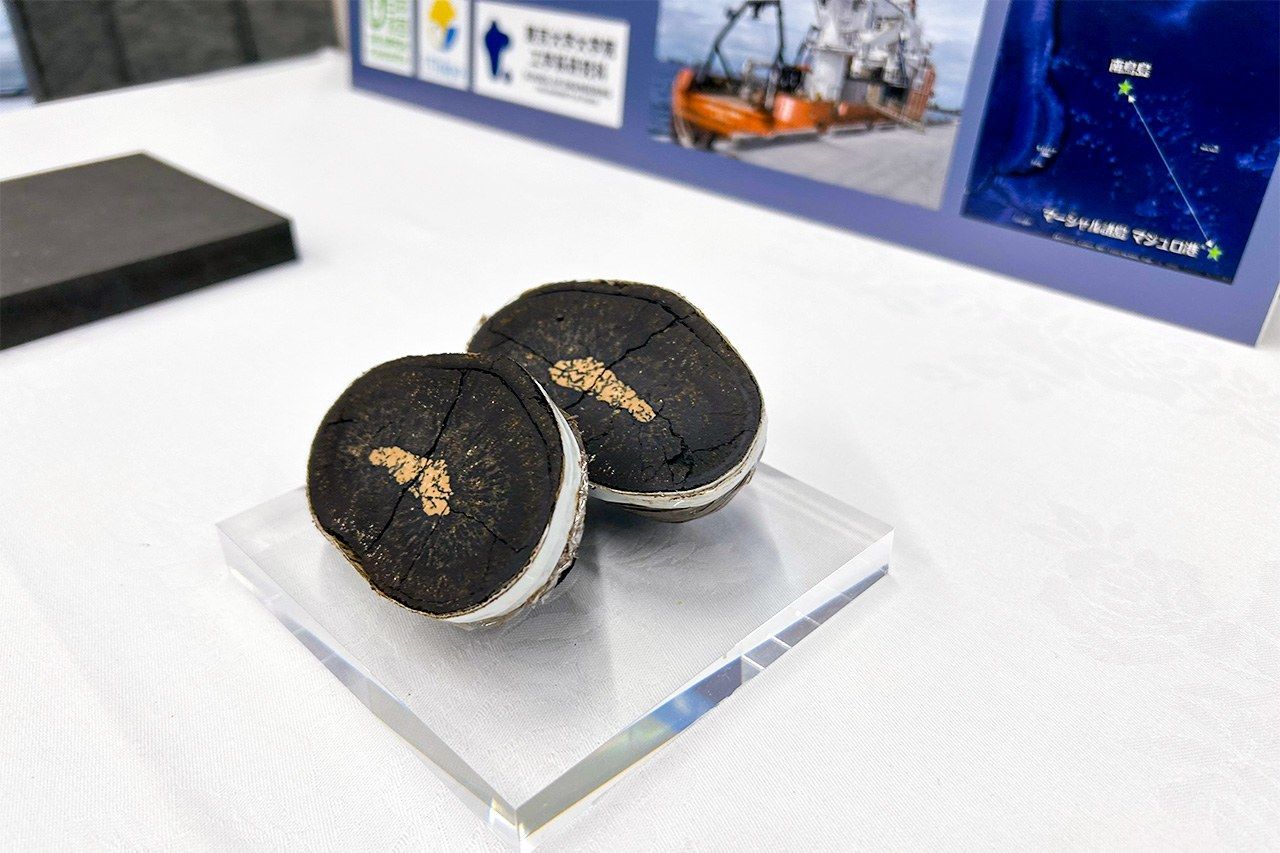 عقيدات المنغنيز المستخرجة في 21 يونيو/حزيران 2024 من قاع البحر في جزيرة ميناميتوري. وهي معروضة في مؤسسة نيبون في طوكيو.