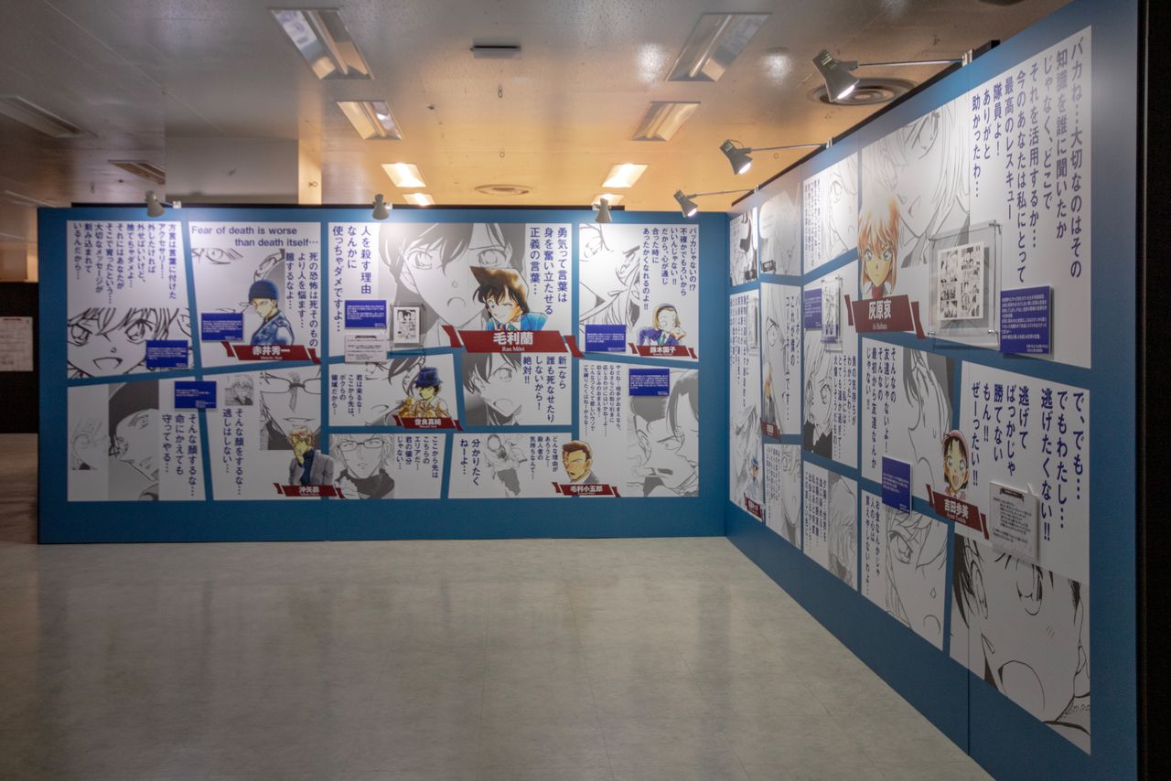 يتكون المعرض من 6 أقسام مركزة حول مواضيع مثل حل الألغاز والرومانسية والجناة الفريدين. يقدم المعرض نظرة فريدة إلى الشخصيات الرئيسية في أيامهم الأولى، بالإضافة إلى لقطات فيديو خاصة تغطي ثلاثة عقود من تاريخ السلسلة. تحتوي هذه الأقسام المختلفة على مواد جاذبة ومثيرة للاهتمام للمعجبين، والتي قد لا تكون متاحة في أي مكان أخر.