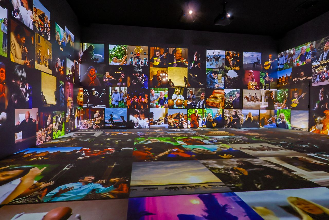 تحول الجدران الأربعة وحتى الأرضية إلى شاشات عرض، لتأخذ الزائر في رحلة قصيرة عبر الأغاني الشعبية والآلات الموسيقية التقليدية. (© Nippon.com)