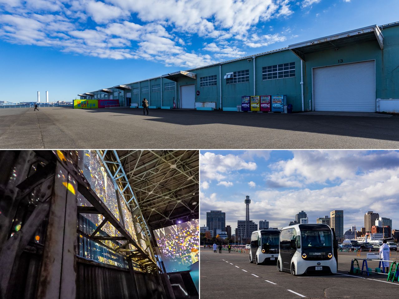 أُقيم المعرض ضمن مشروع إعادة تطوير رصيف ياماشيتا، داخل مستودع يعود إلى حقبة شووا، بينما تؤمّن مركبات تويوتا e-Palette خدمات التنقّل عبر الرصيف الممتد. (© Nippon.com)