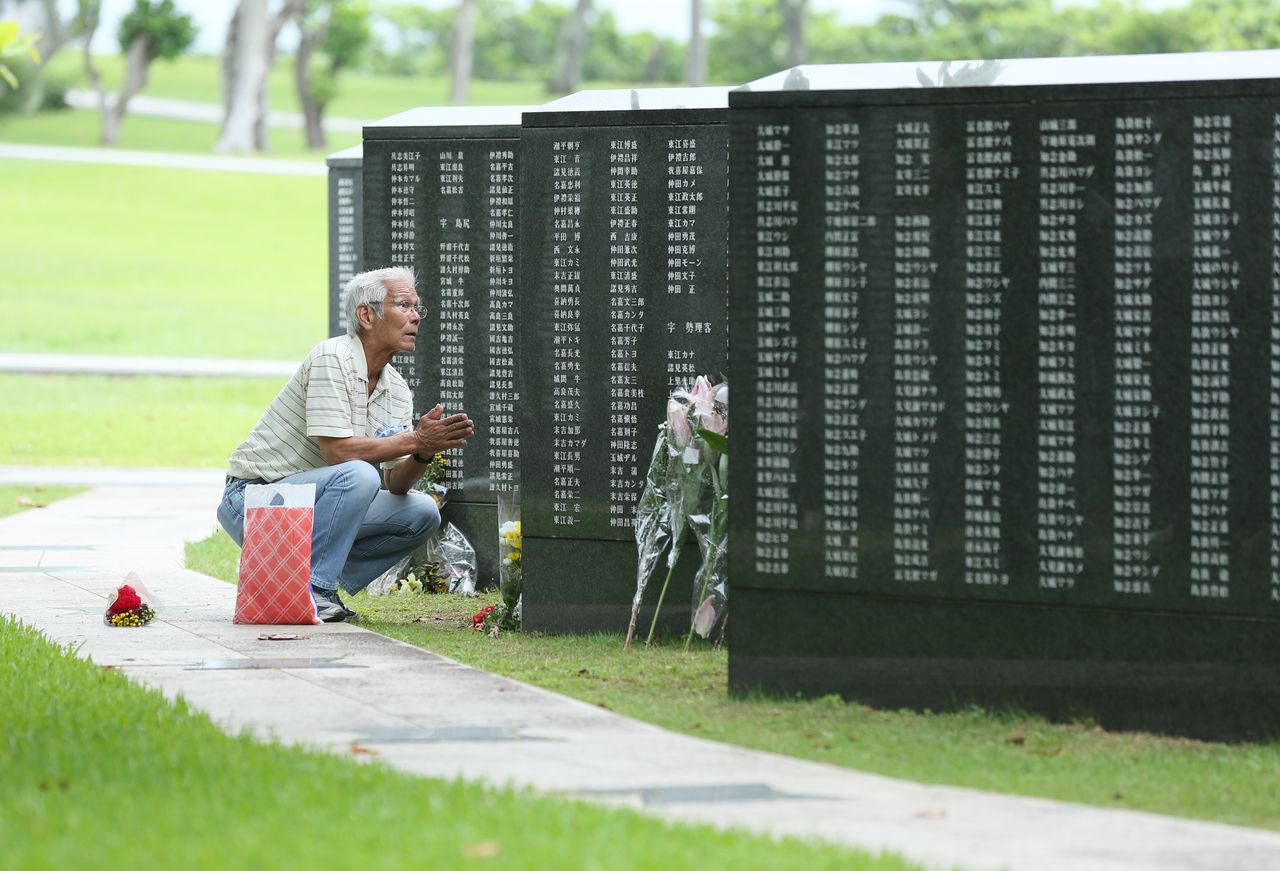 أحد الرجال يبتهل بالدعاء أمام حجر الزاوية للنصب التذكاري للسلام في حديقة السلام التذكارية في مدينة إيتومان بمحافظة أوكيناوا في الثالث والعشرين من يونيو/ حزيران 2020. جيجي برس.