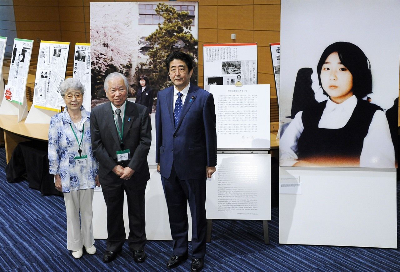 رئيس الوزراء شينزو آبى (يمين الصورة) مع (يوكوتا شيغيرو) (في الوسط) وزوجته (ساكي) في طوكيو في العاشر من يونيو/ حزيران. وعلى يمين الصورة تظهر لوحة لـ (يوكوتا ميغومي)، الفتاة التي كانت قد اختُطفت من قبل أحد عملاء كوريا الشمالية وهي في الثالثة عشرة من عمرها. جيجي برس.