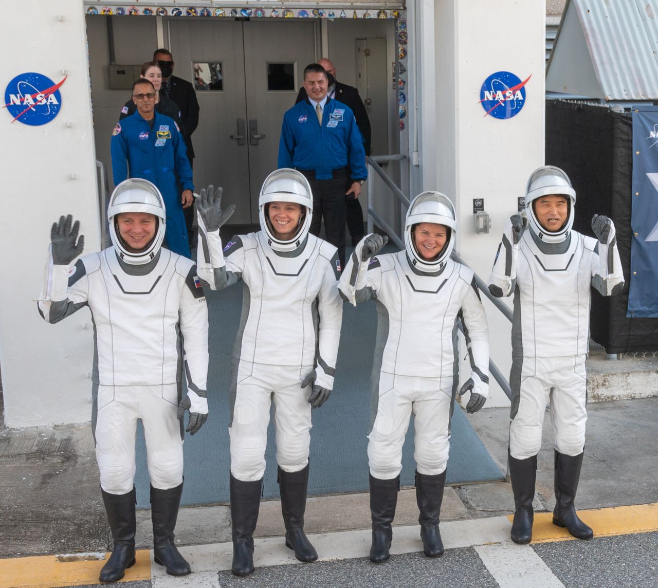 أونيشي تاكويا (على اليمين) يحيي المهنئين قبل رحلته الفضائية في 14 مارس/ آذار 2025. (© سكوت شيلكه/ سيبا الولايات المتحدة الأمريكية عبر رويترز كونيكت)