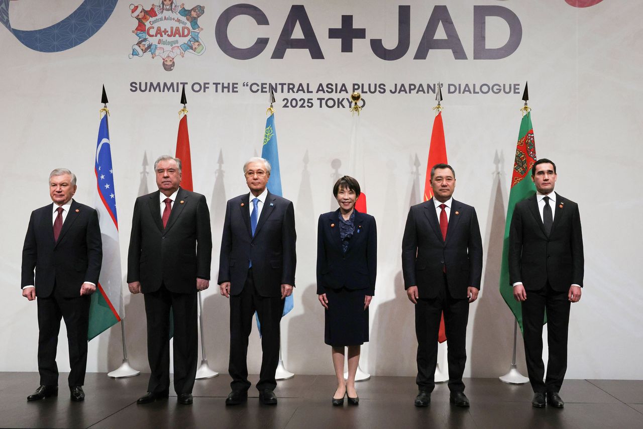 رئيسة الوزراء اليابانية تاكايتشي ساناي بقادة خمس دول في آسيا الوسطى (كازاخستان، أوزبكستان، تركمانستان، قيرغيزستان، طاجيكستان) في أول قمة من نوعها في طوكيو. يتفقون على تعزيز التعاون لتقوية سلاسل التوريد للمعادن الرئيسية الوفيرة في المنطقة.
