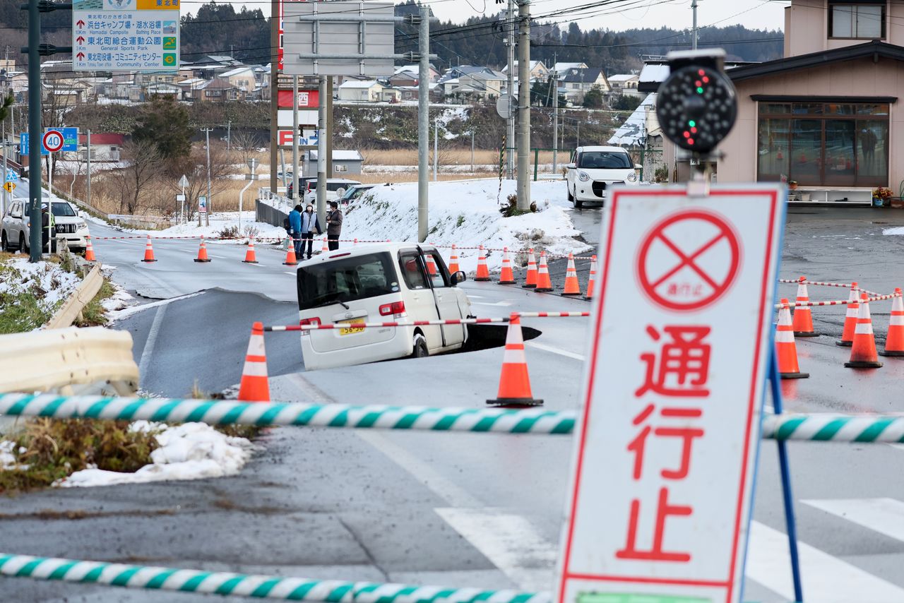 طريق تضرر من الزلزال في بلدة توهوكو بمحافظة أوموري في 9 ديسمبر 2025. (© جيجي برس)