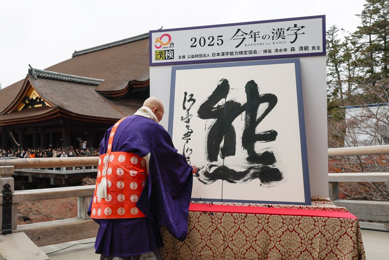موري سيهان، كبير كهنة معبد كيوميزوديرا، يكتب 熊 (كانجي العام 2025) في 12 ديسمبر/ كانون الأول في المعبد بكيوتو. (© جيجي برس)